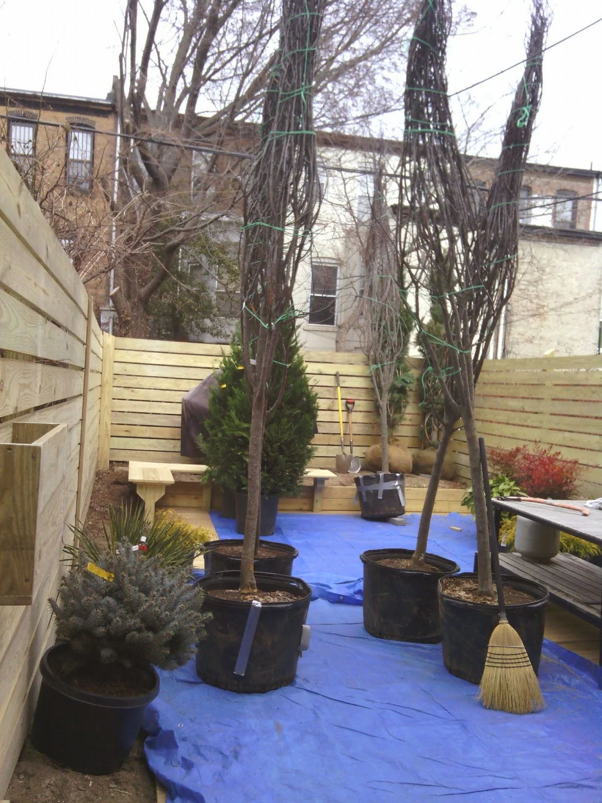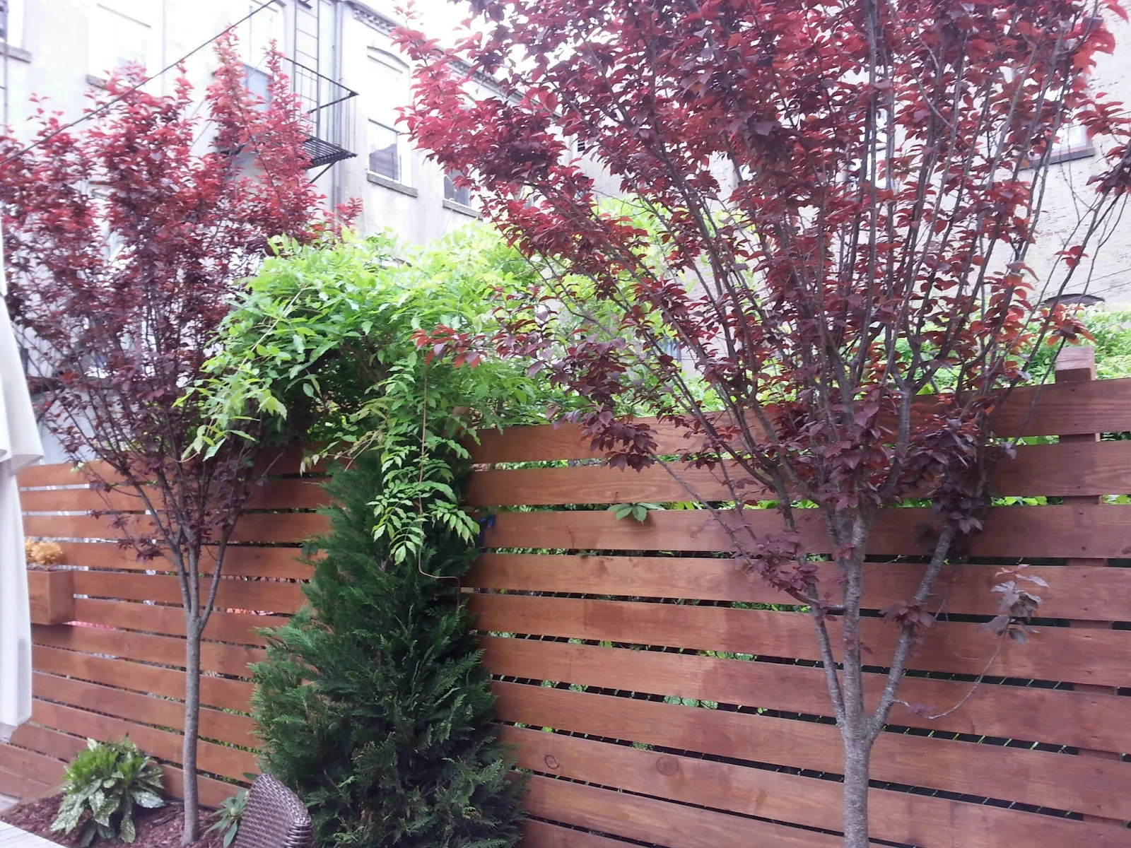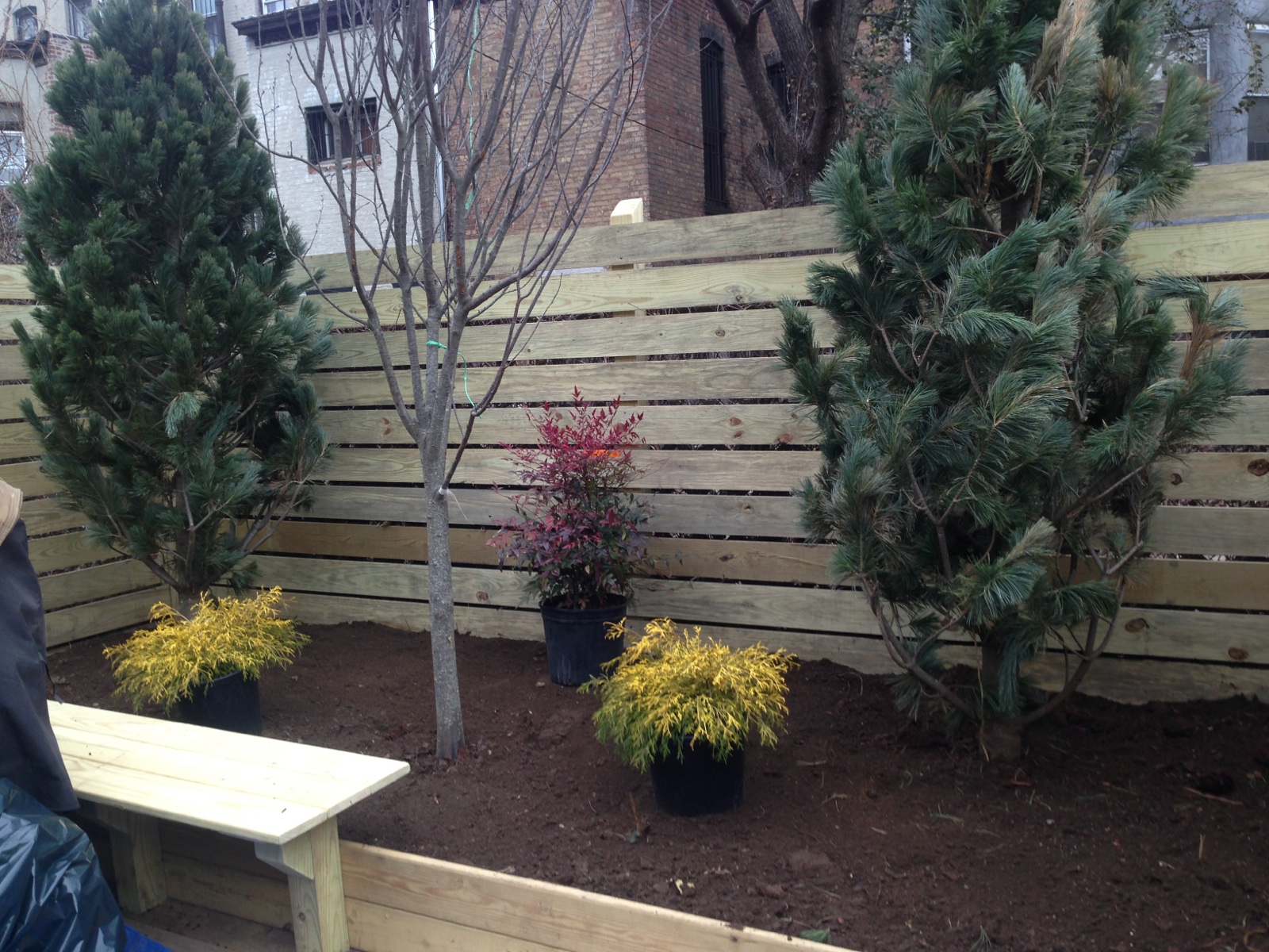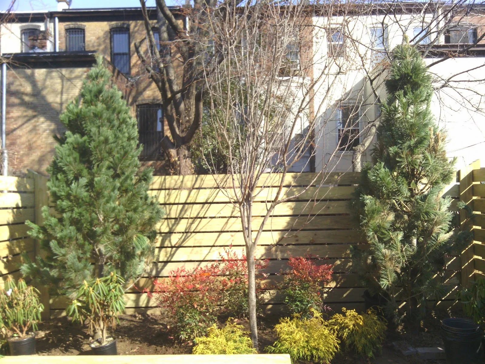 This unorganized blog is basically a bunch of photos from a custom landscape design installation of a NYC townhouse rear yard landscape with custom deck, custom built horizontal fence, all custom buikt planters with built in seating (a planter bench) and a load of professional size and quality trees such as purple plumb, white pine, bamboo domestica, yucca, gold thread cypress,globe blue spruce,hydrangea and more. I love landscaping and trees, shrubs and foliage make me happy!