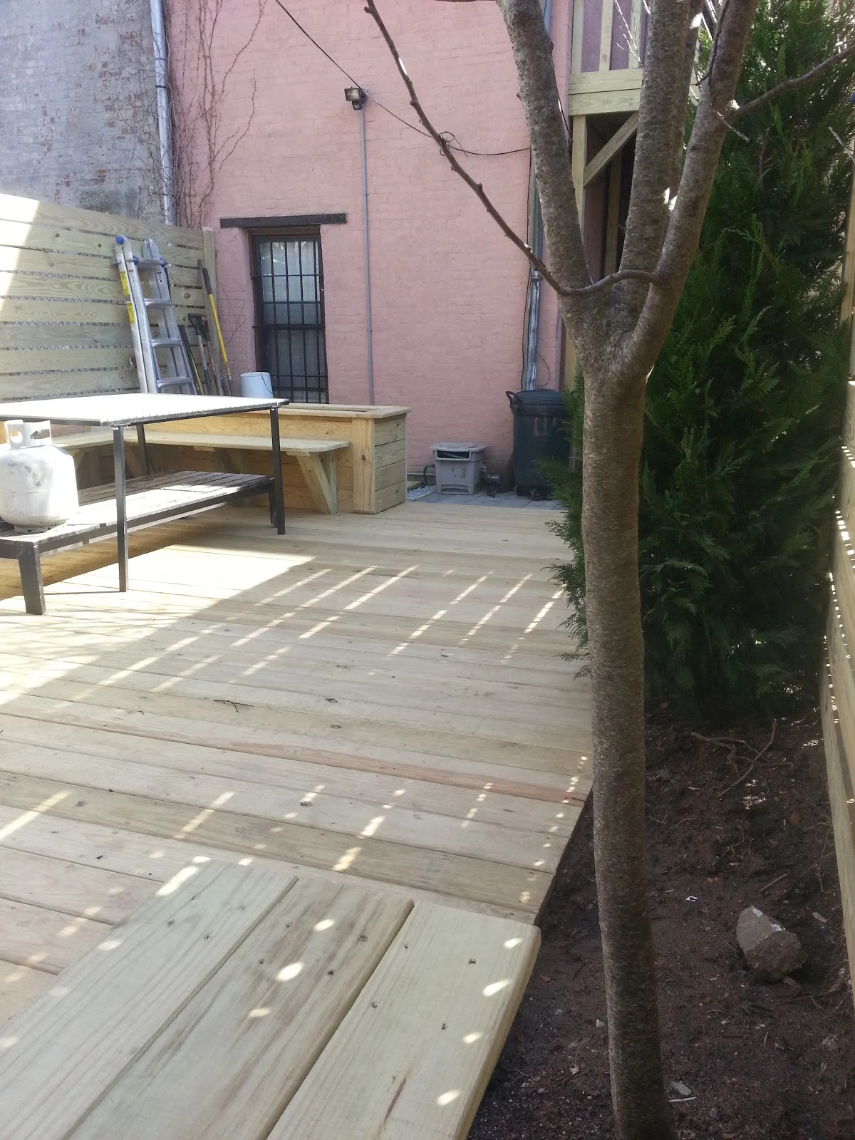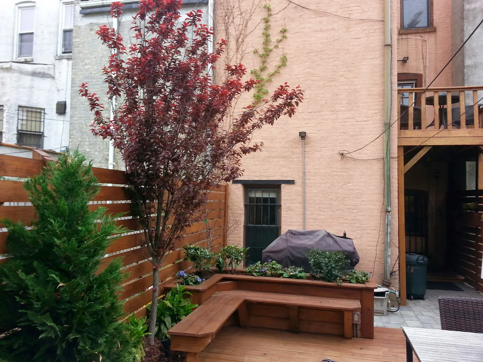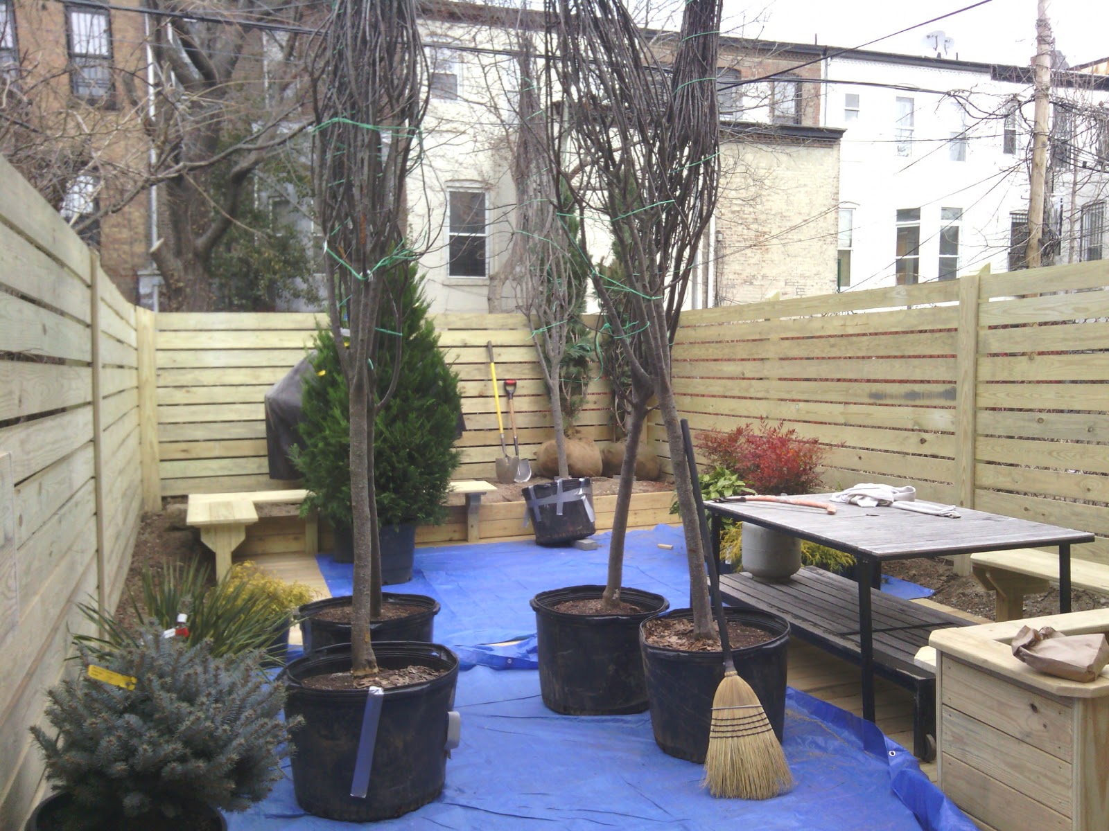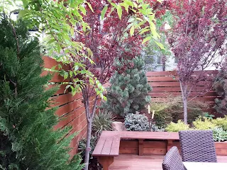 This unorganized blog is basically a bunch of photos from a custom landscape design installation of a NYC townhouse rear yard landscape with custom deck, custom built horizontal fence, all custom buikt planters with built in seating (a planter bench) and a load of professional size and quality trees such as purple plumb, white pine, bamboo domestica, yucca, gold thread cypress,globe blue spruce,hydrangea and more. I love landscaping and trees, shrubs and foliage make me happy!