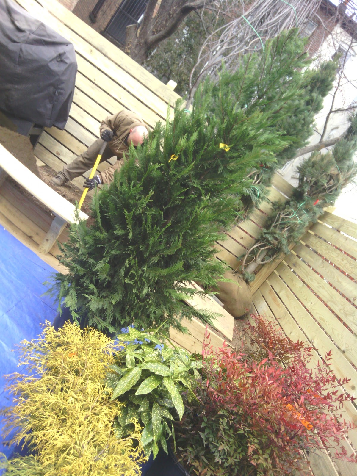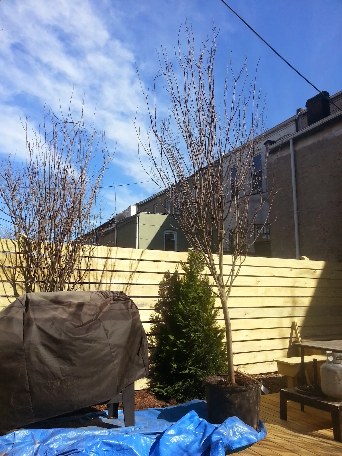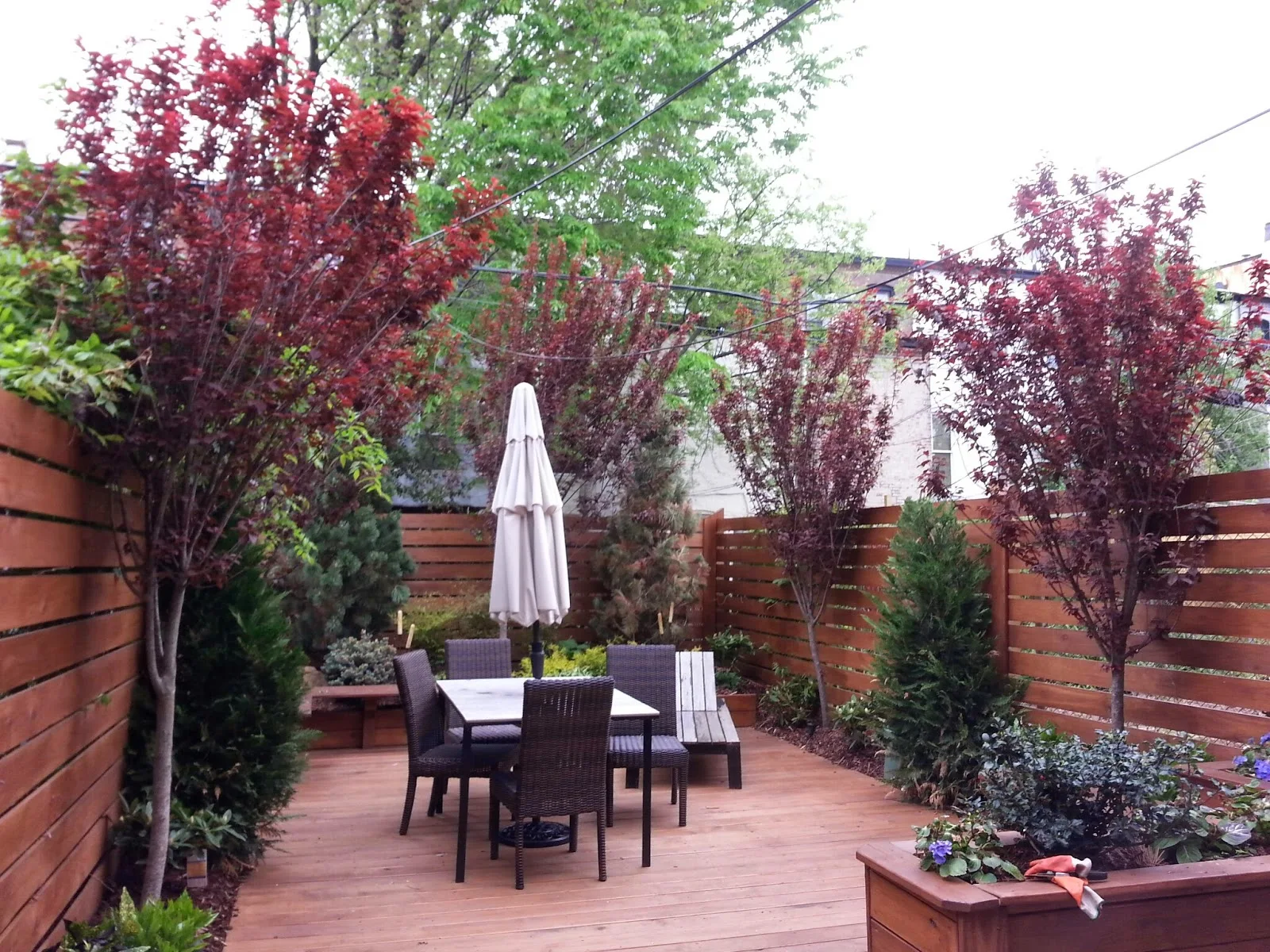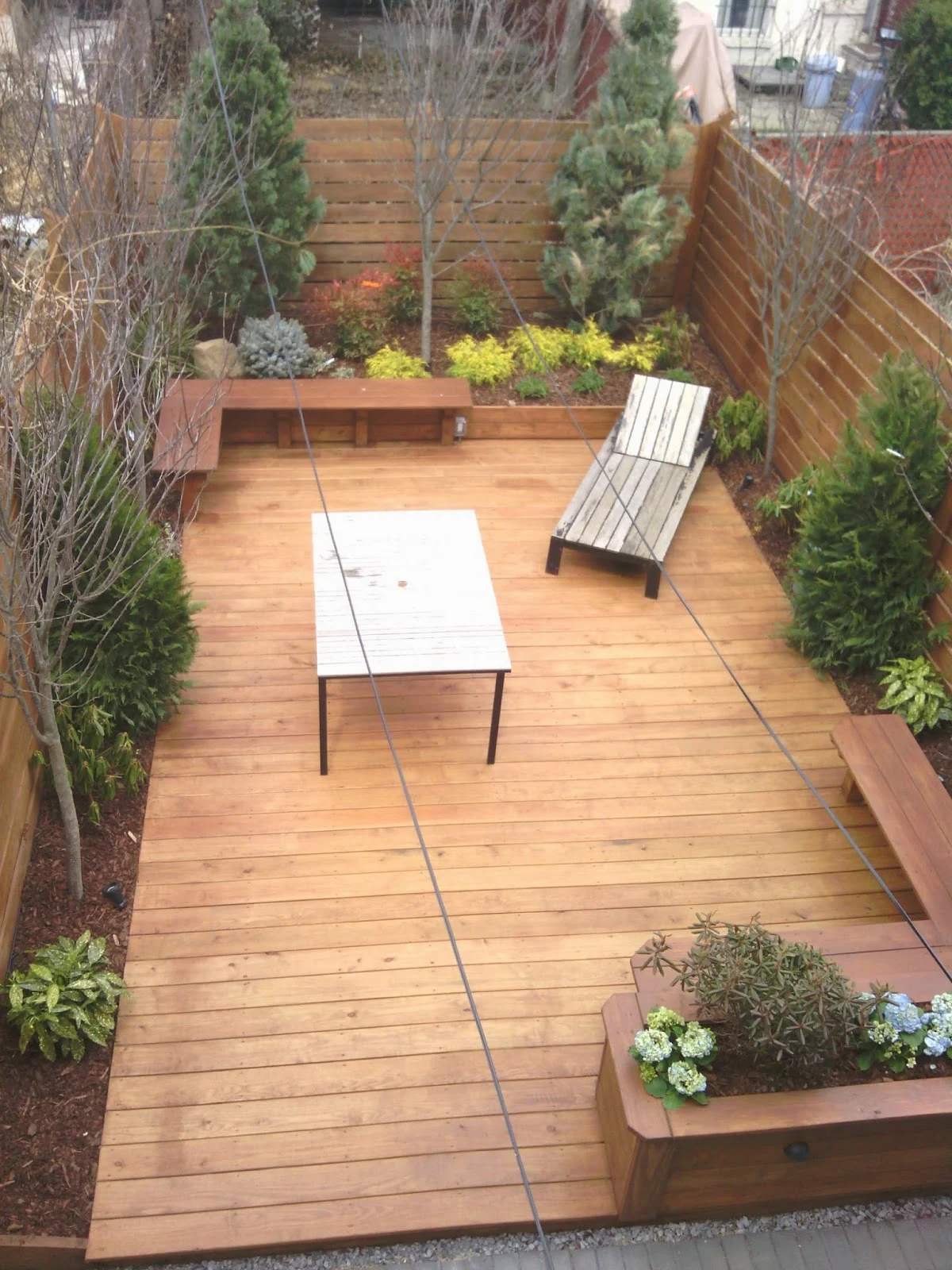 This unorganized blog is basically a bunch of photos from a custom landscape design installation of a NYC townhouse rear yard landscape with custom deck, custom built horizontal fence, all custom buikt planters with built in seating (a planter bench) and a load of professional size and quality trees such as purple plumb, white pine, bamboo domestica, yucca, gold thread cypress,globe blue spruce,hydrangea and more. I love landscaping and trees, shrubs and foliage make me happy!