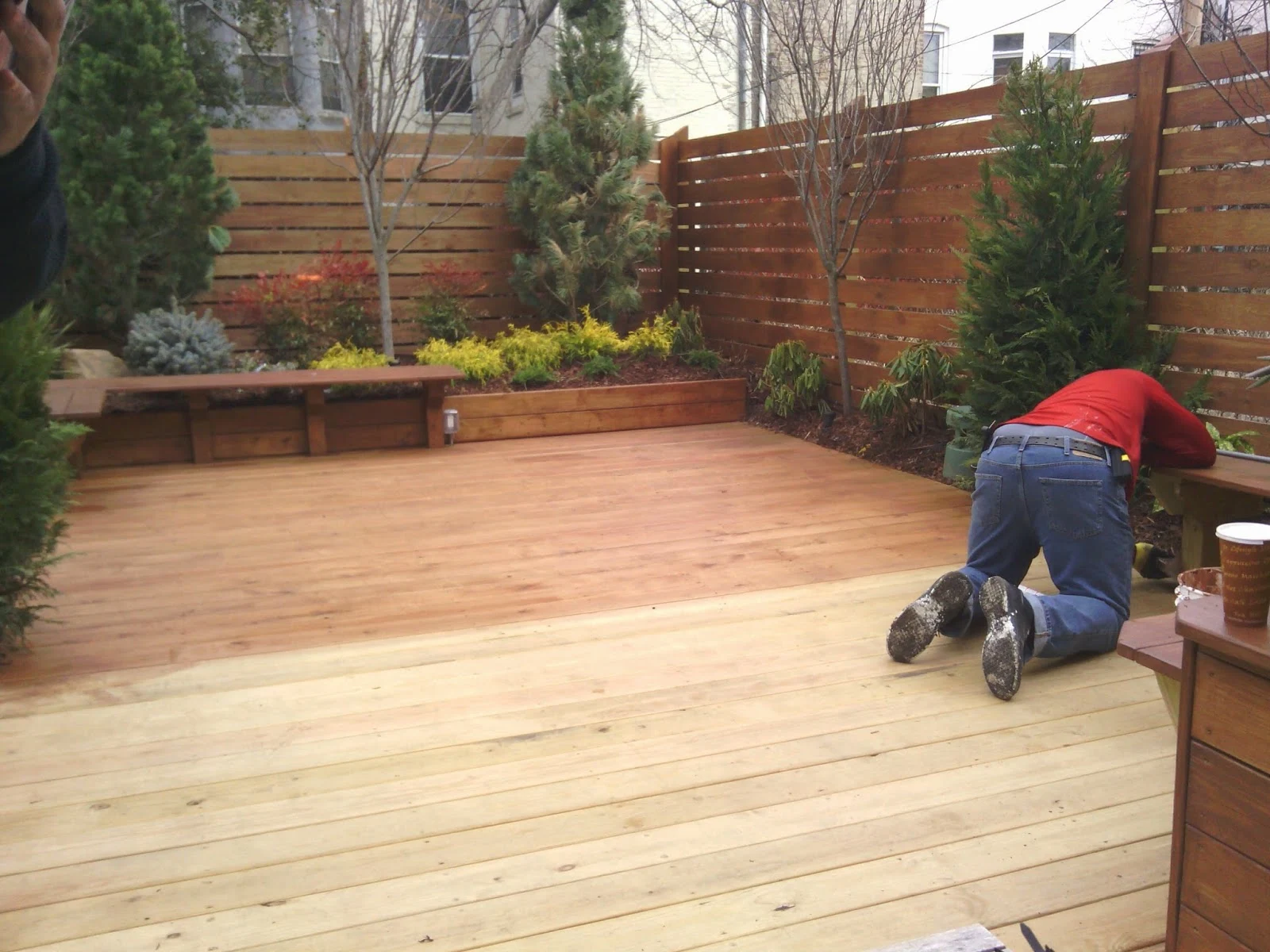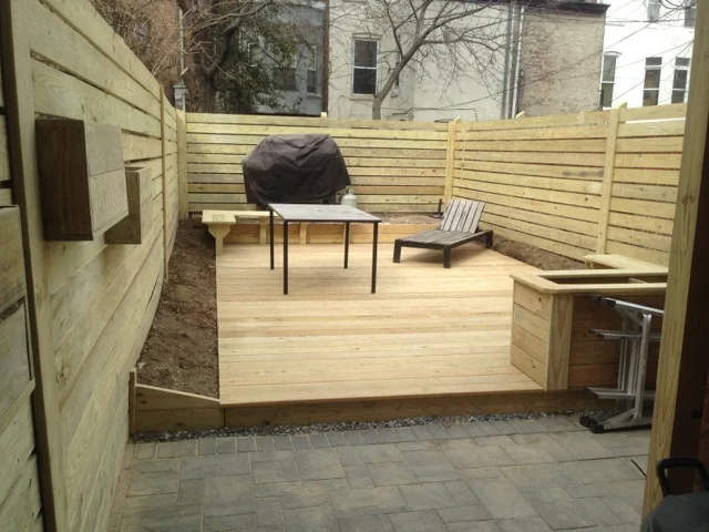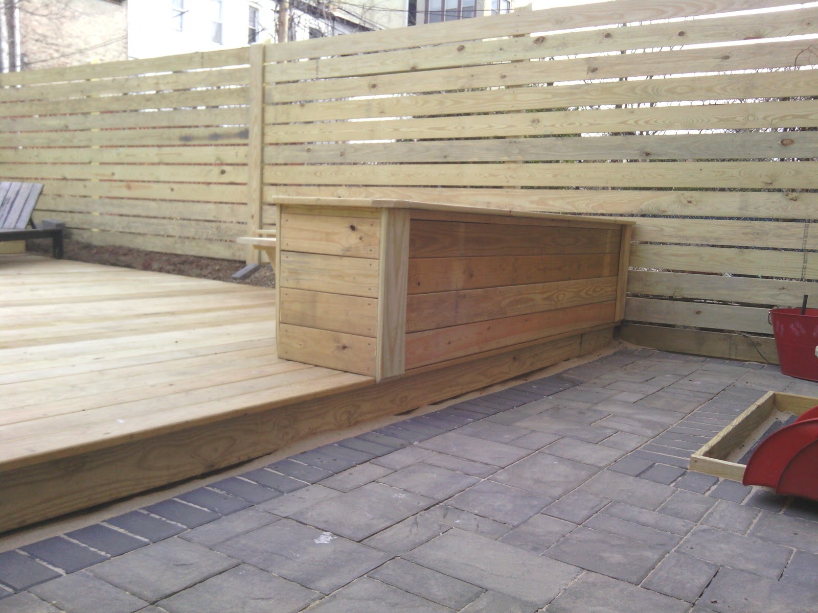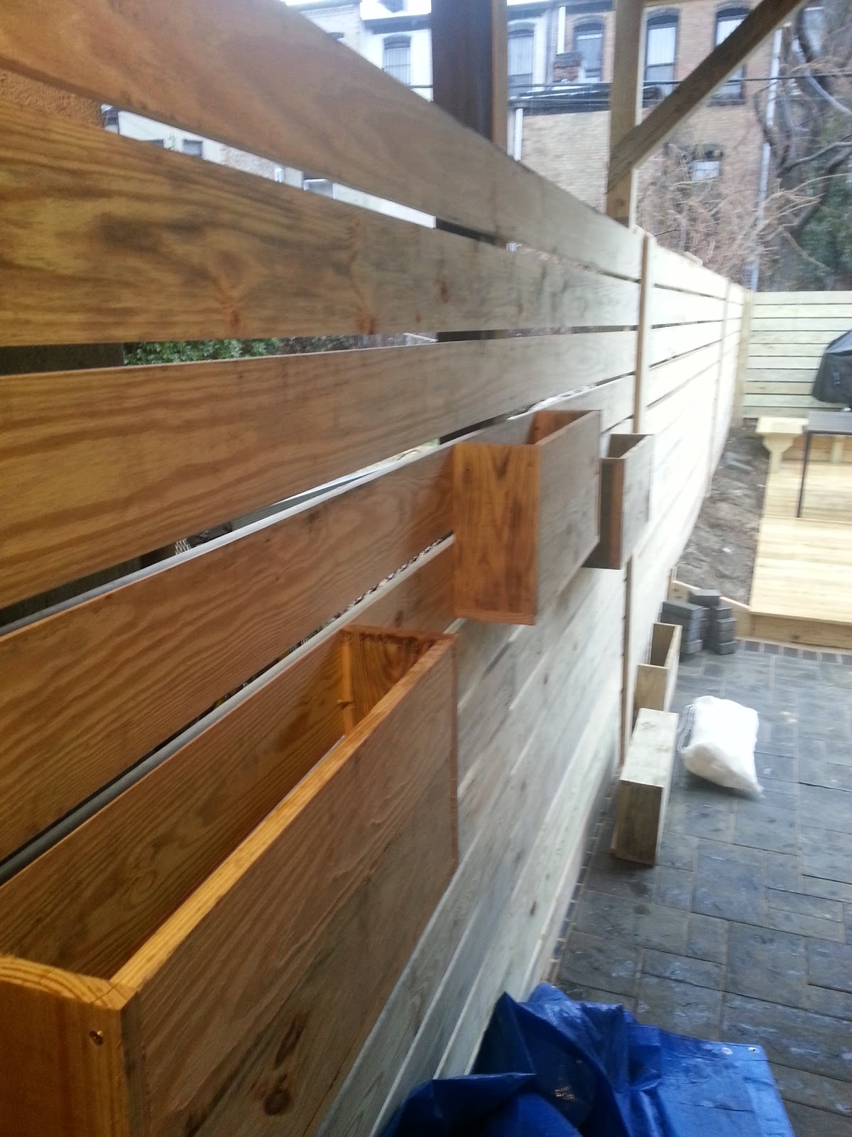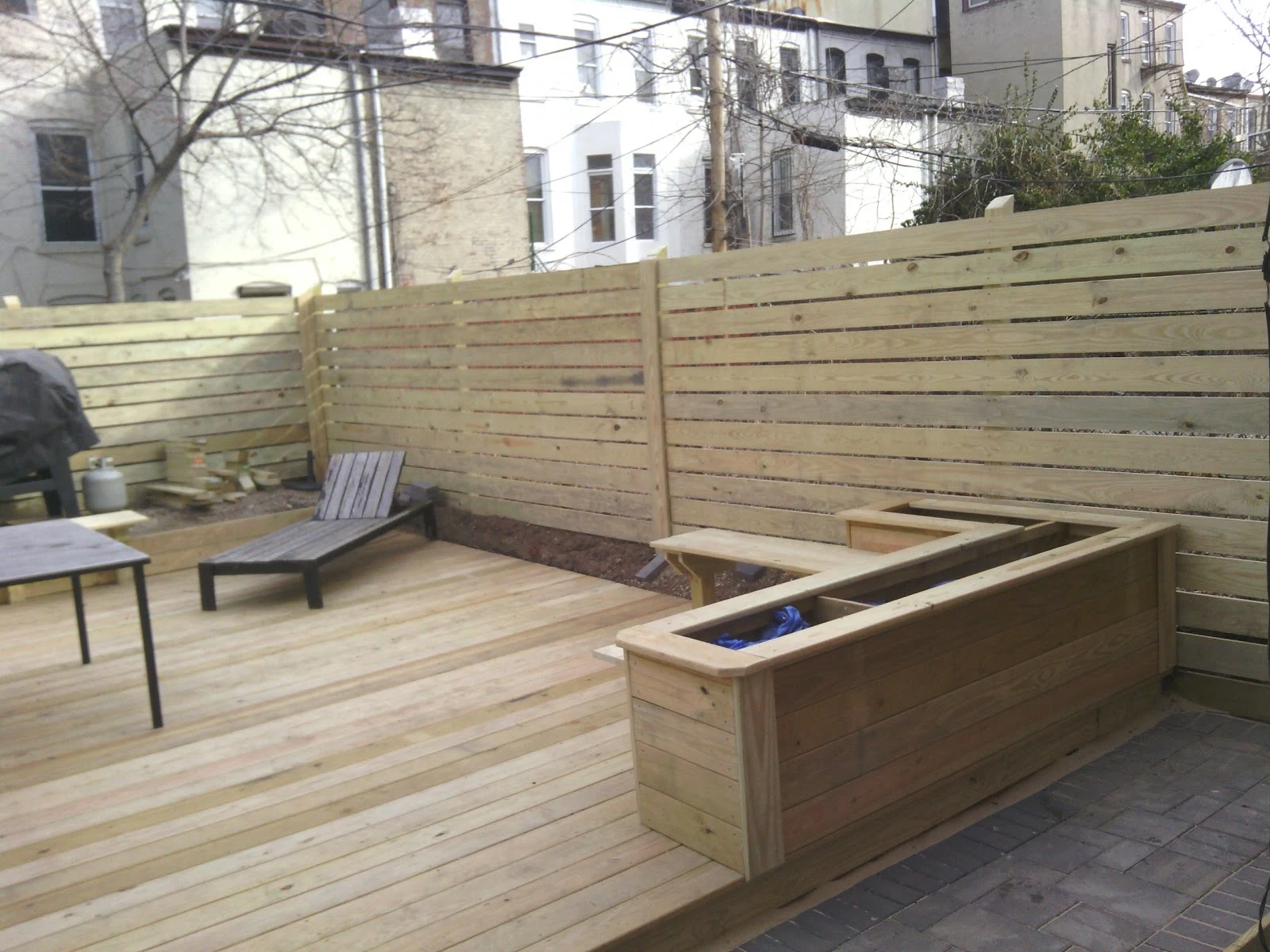 The deck installation, horizontal custom built fence, custom made planters with benches,