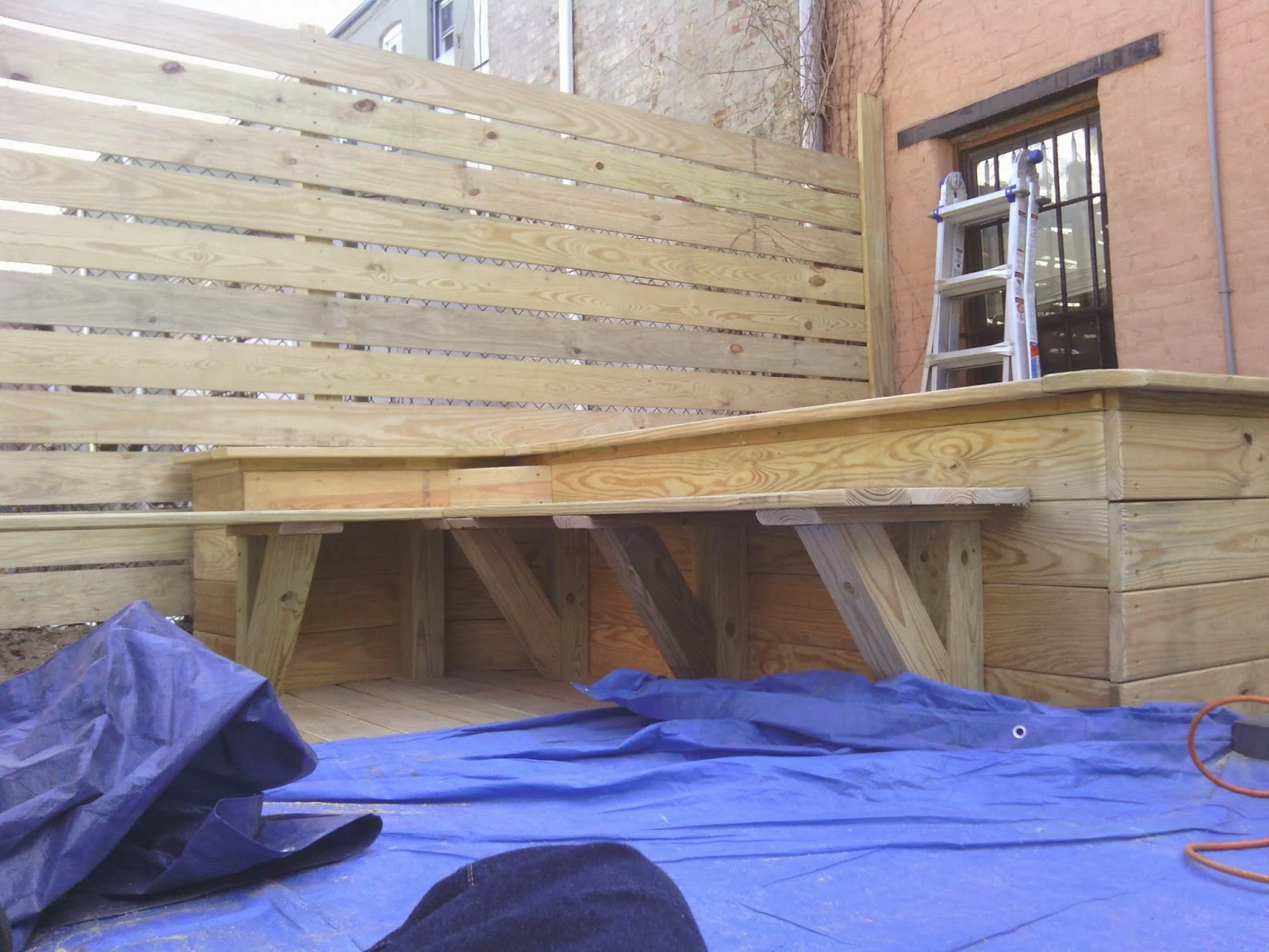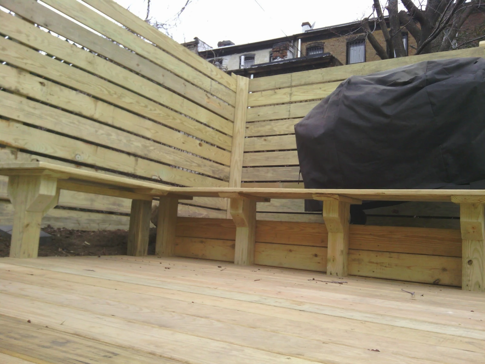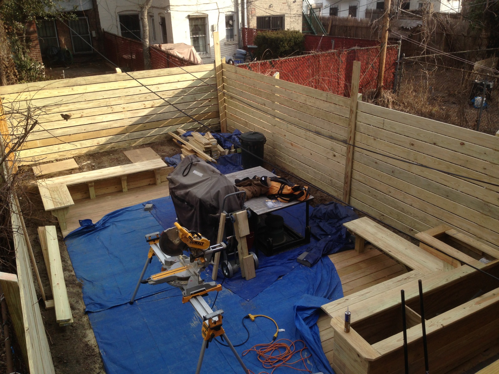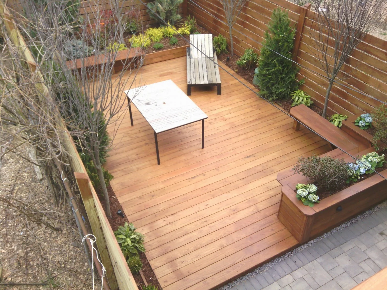 The deck installation, horizontal custom built fence, custom made planters with benches,