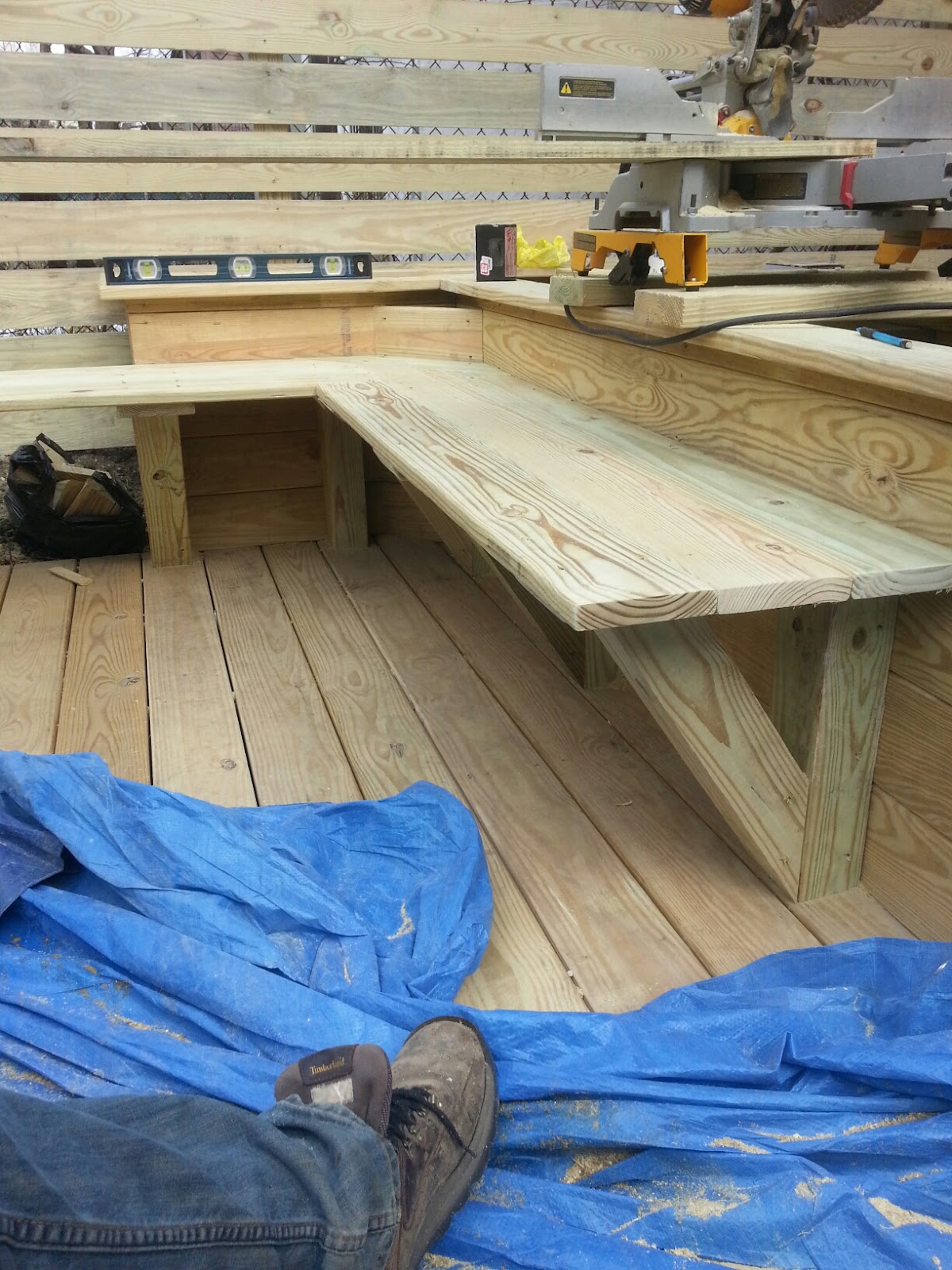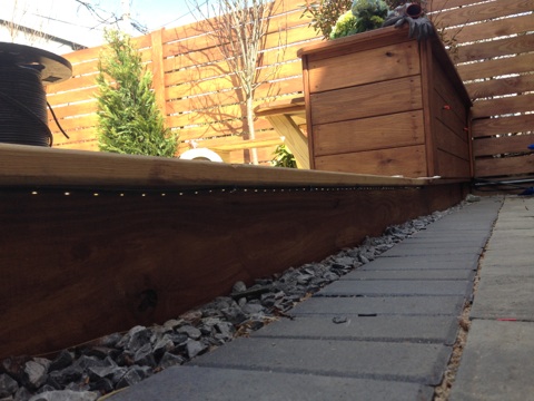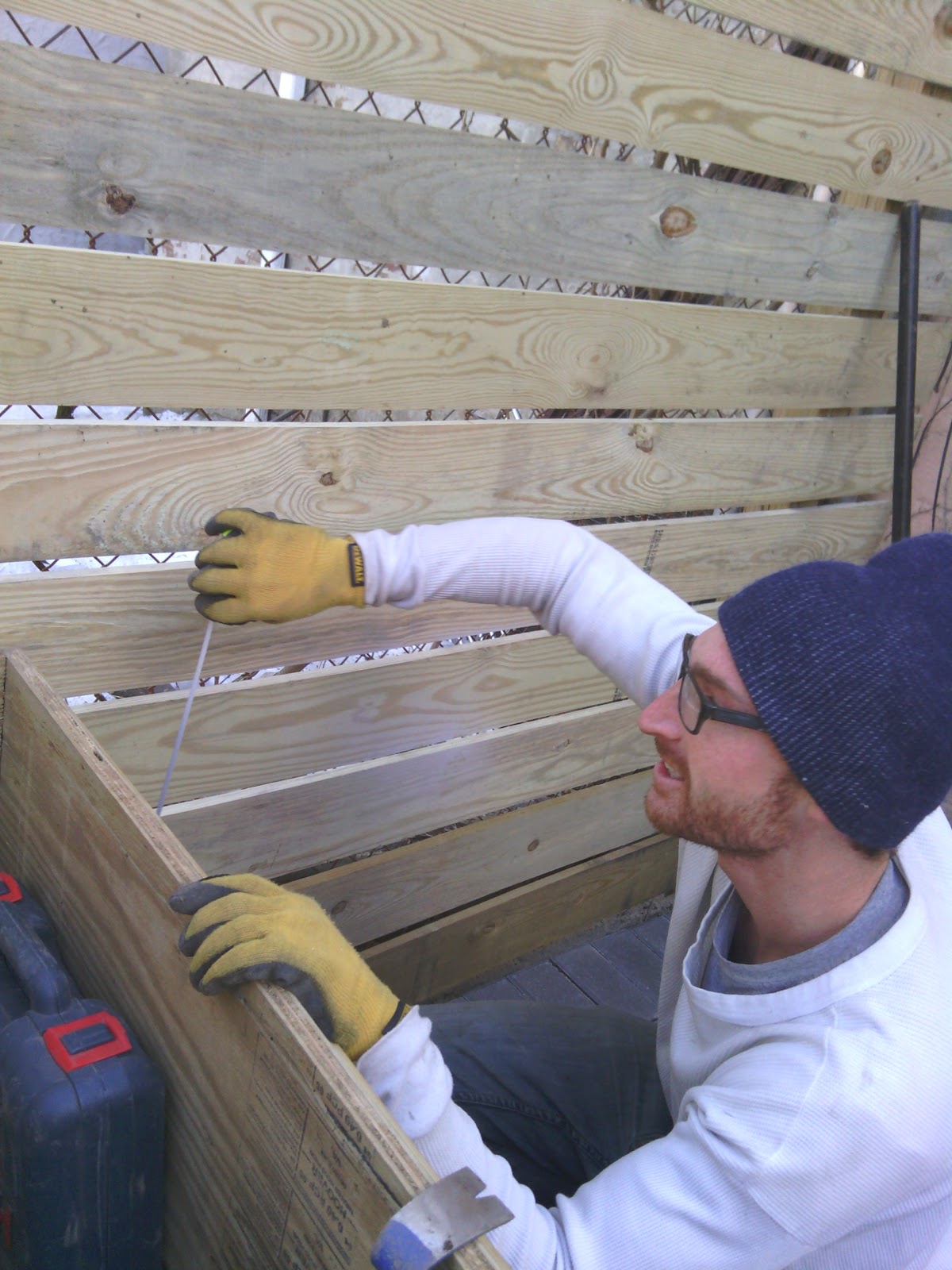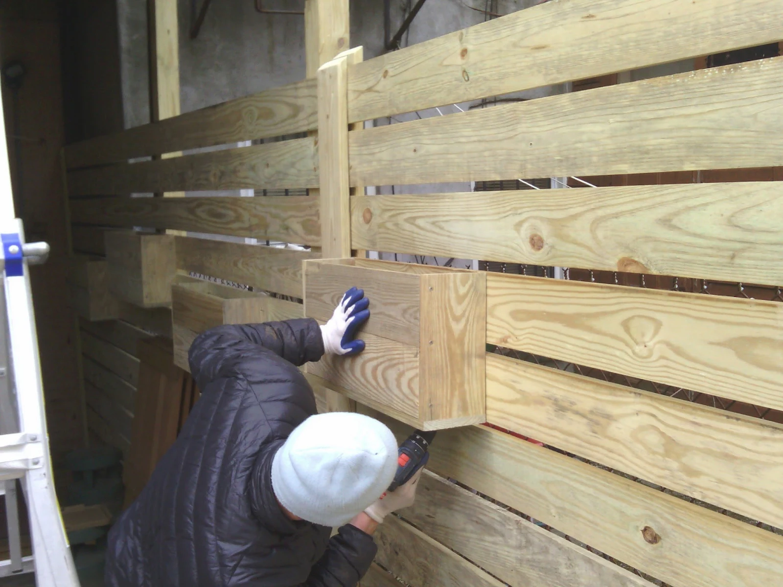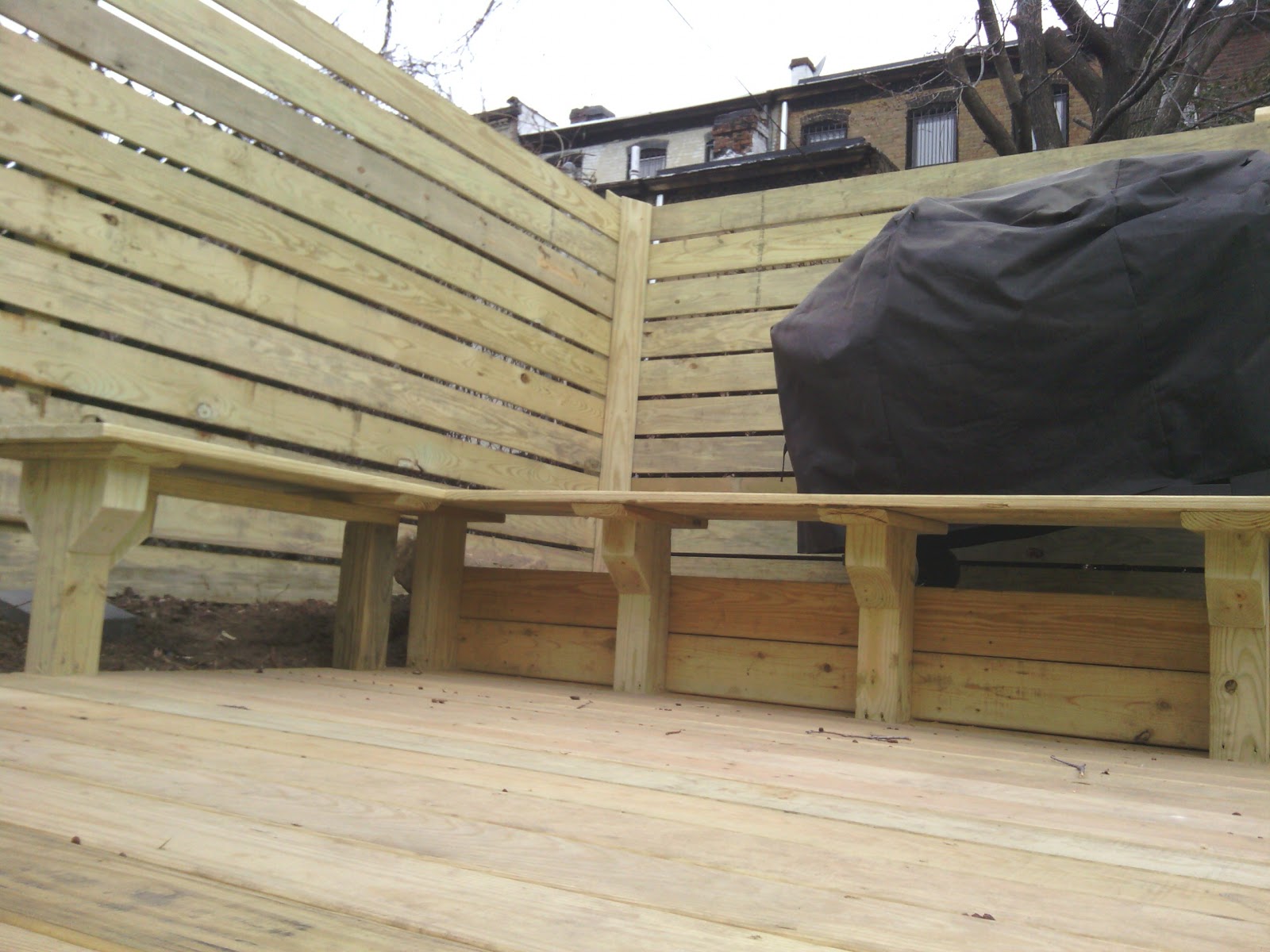 The deck installation, horizontal custom built fence, custom made planters with benches,