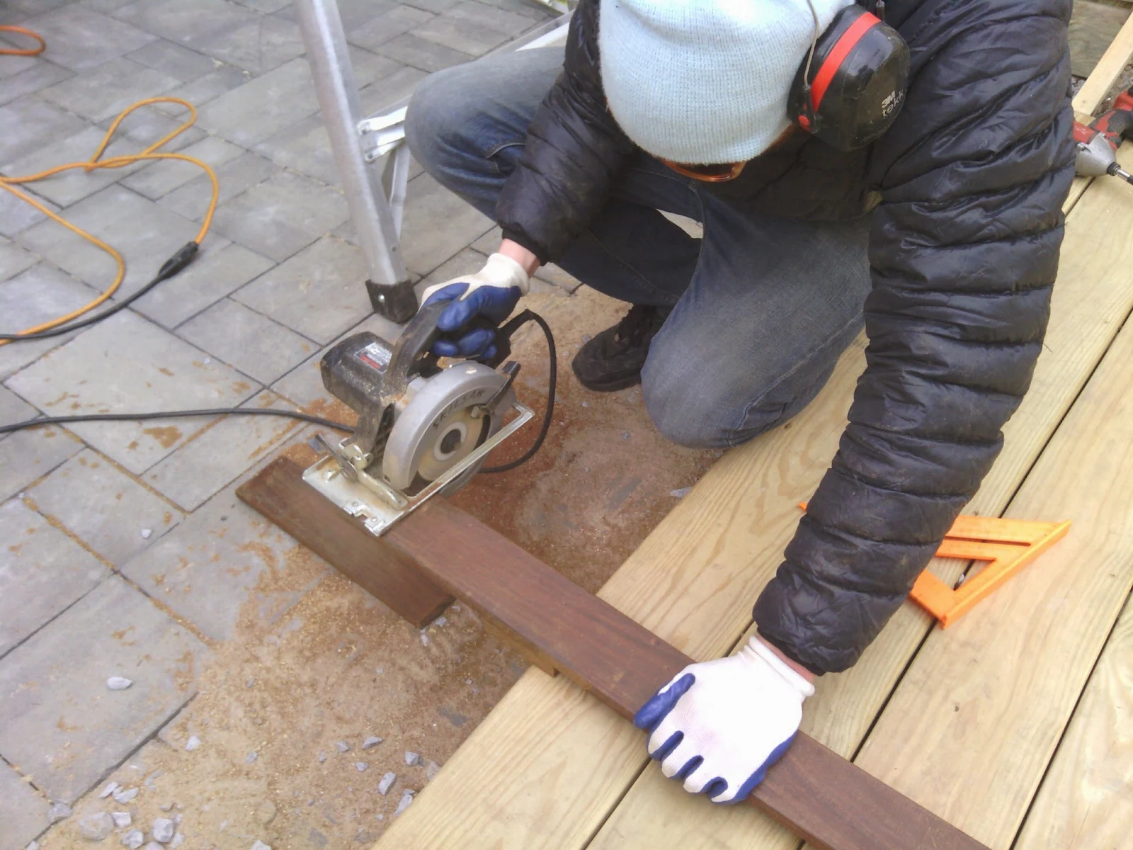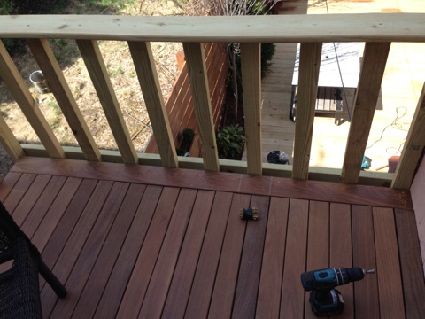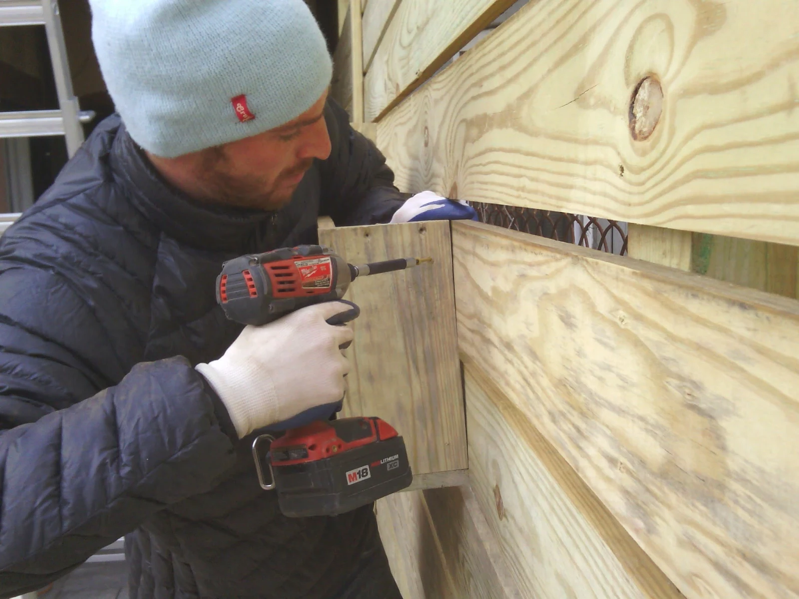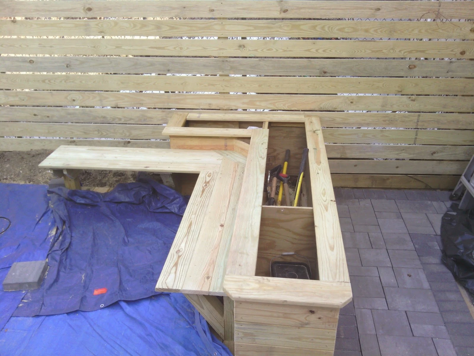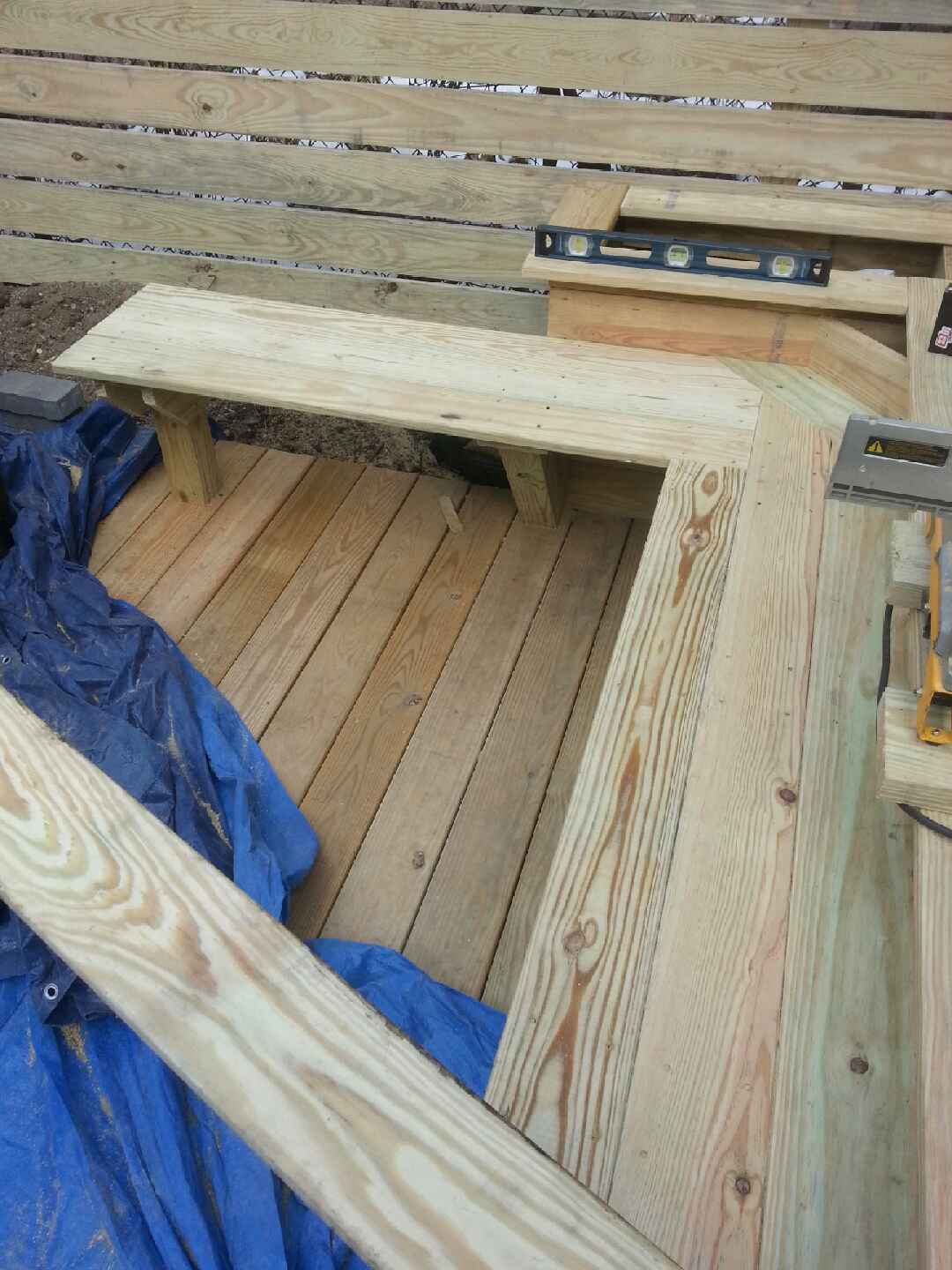 The deck installation, horizontal custom built fence, custom made planters with benches,