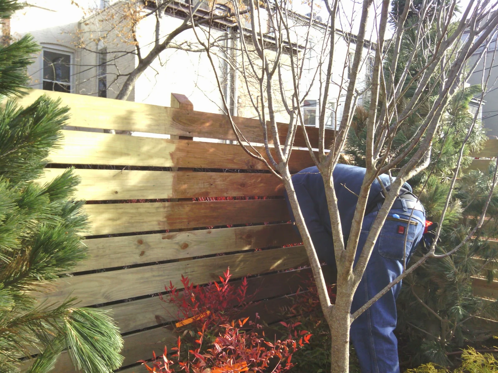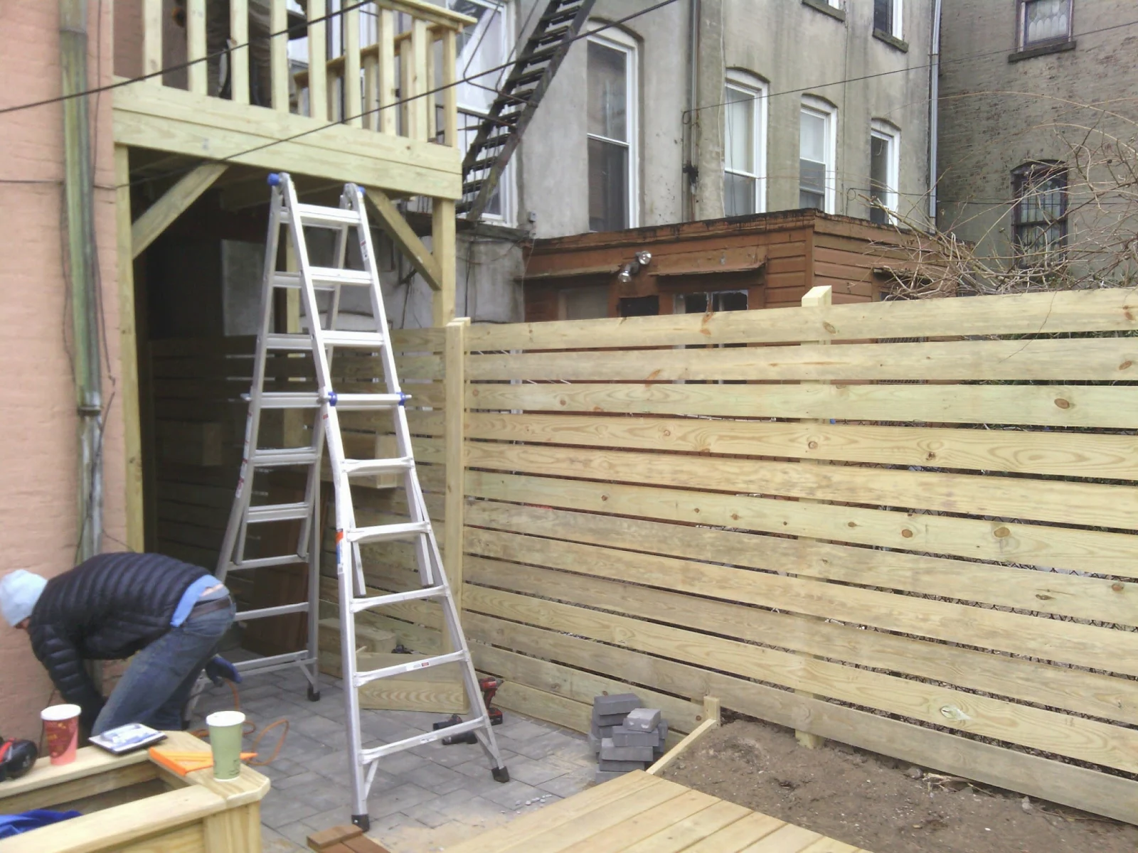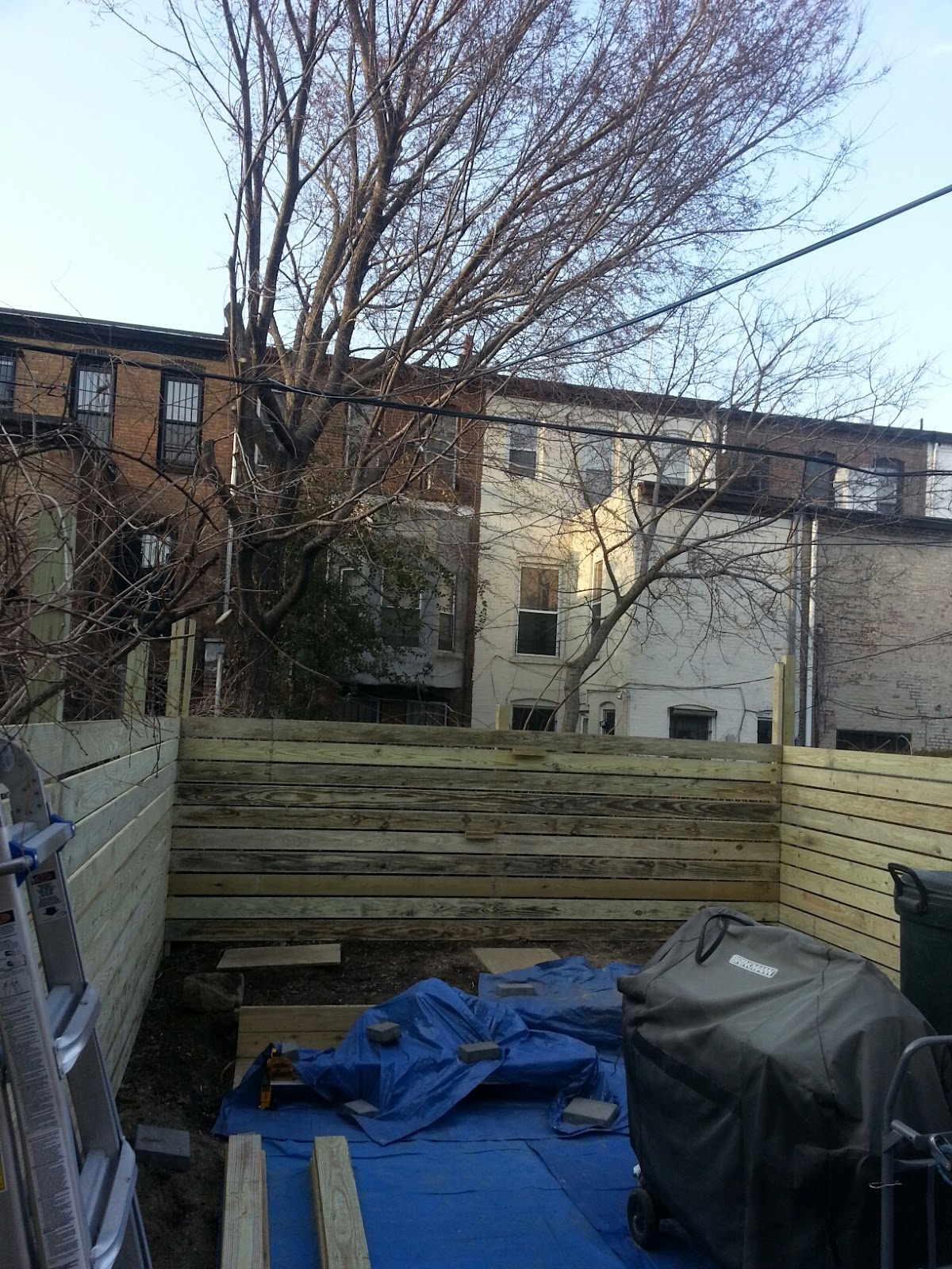 Before Image of a town house rear yard had this home dept wood fence, it was just...terrible but