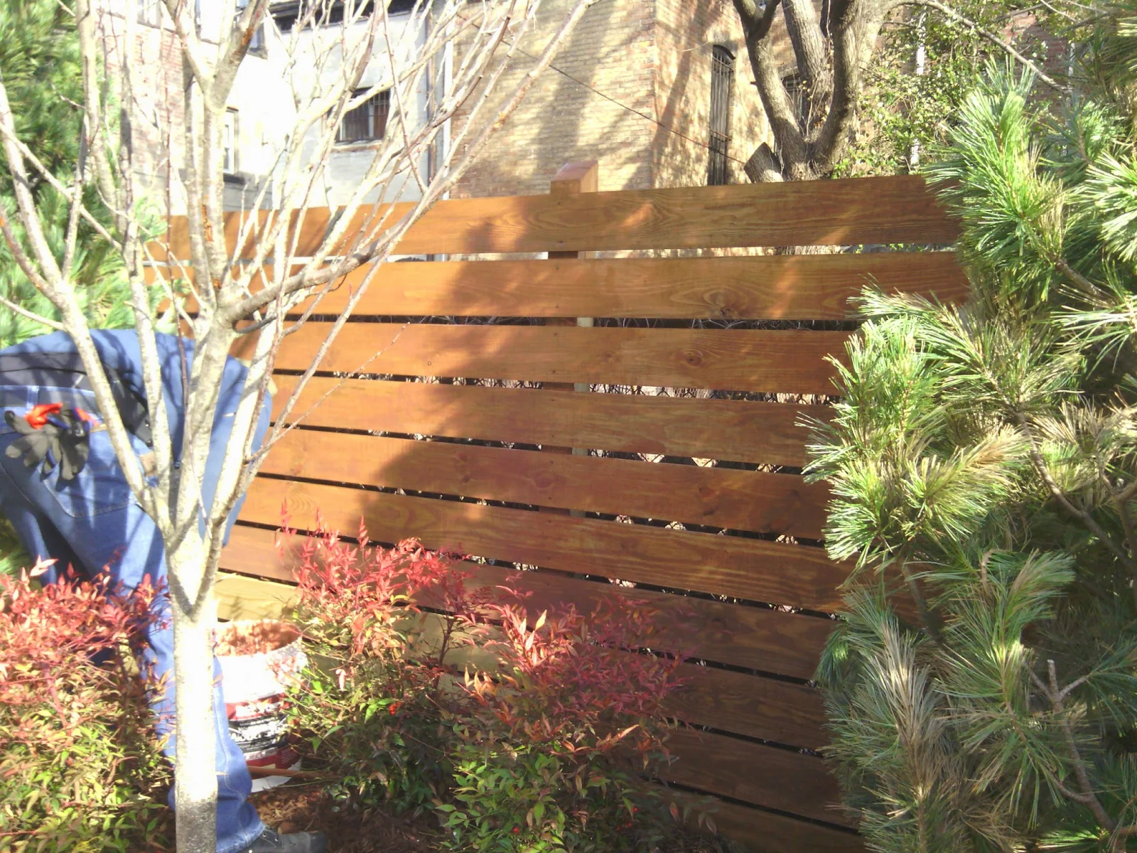 A custom built IPE horizontal fence, bluestone patio and turf, landscape lighting and drip irrigation system by New York Plantings Garden Designers and Landscape Contractors NYC