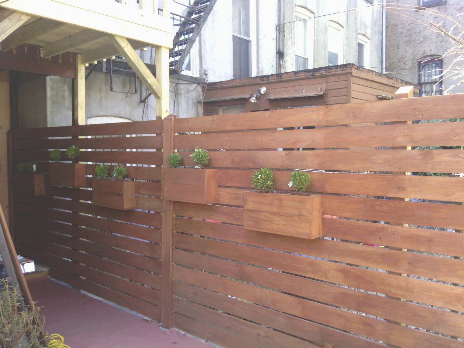 | A Custom townhouse brownstone rear yard landscape with a custom wood deck, horizontal wood fence, custom made planters and the bold garden designs of Todd Nappi at NewYorkPlantings.com NYC |