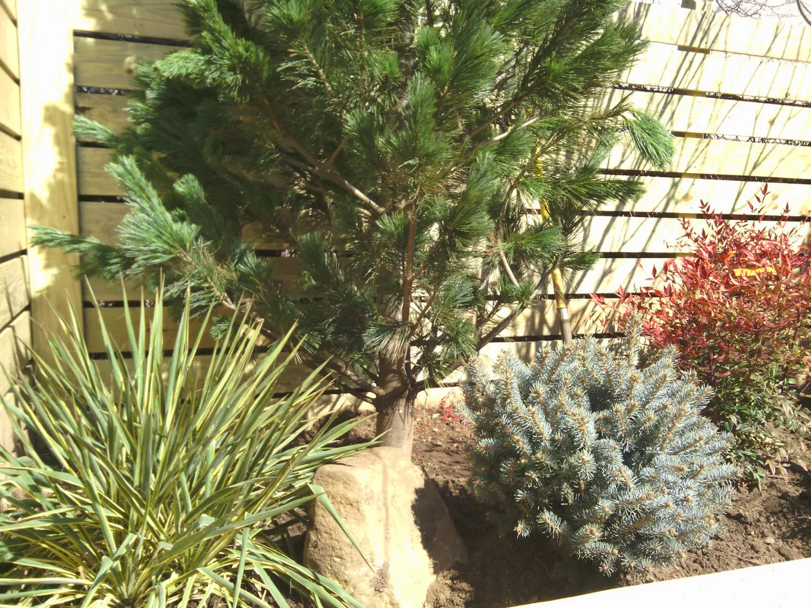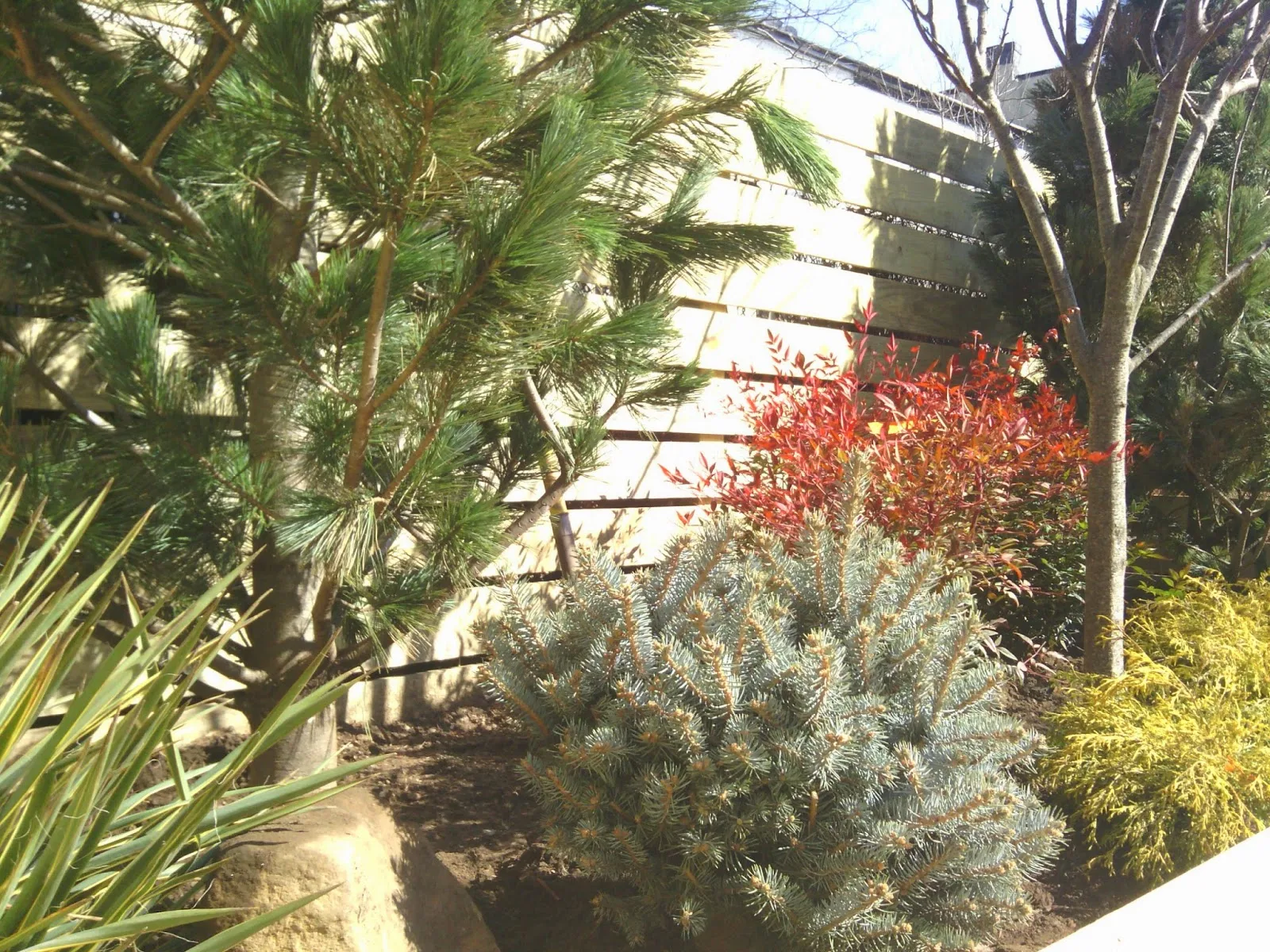 awesome landscape garden with purple plumb flowering cherry, dwarf Japanese pine called vanderwolf, dwarf domestica bamboo, gold thread cypress, hydrangea, pjm rhododendron, picea pungens globulosa blue spruce, blue rug juniper and other tasty landscape bits such as ornamental grasses, yucca and more.